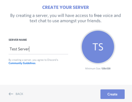 Далее дайте серверу имя. Вы также можете щелкнуть по кругу с инициалами имени вашего сервера, чтобы выбрать рекомендуемое изображение для сервера. Нажмите «Создать», как только вы закончили с вашим именем и изображением.