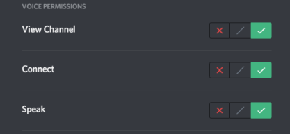 Вы можете сделать то же самое для голосовых каналов, но разрешения немного отличаются. Вы хотите изменить разрешения для просмотра канала, подключения и говорить для каждой роли.