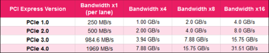 - PCI Express 4.0: имеет пропускную способность 1969 МБ / с на линию