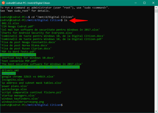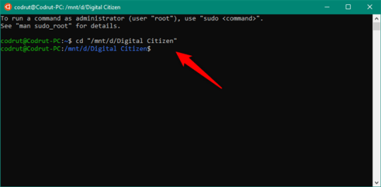 Обратите внимание, что все диски на вашем компьютере с Windows 10 смонтированы в /mnt/[буква диска]. Например, диск C, на котором обычно установлена Windows 10, находится по следующему адресу: /mnt/c. Диск D, если он у вас есть, находится в /mnt/d и так далее. Давайте рассмотрим пример: если вы хотите перейти к папке Digital Citizen, найденной на вашем диске D, вам нужно будет выполнить команду Bash: cd "/mnt/d/Digital Citizen".