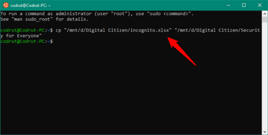 Например, предположим, что мы хотим скопировать файл с именем incognito.xlsx, который находится в нашей папке Digital Citizen, в подпапку « Безопасность для всех» . Для этого нам нужно выполнить команду cp "/mnt/d/Digital Citizen/incognito.xlsx" "/mnt/d/Digital Citizen/Security for Everyone".