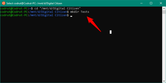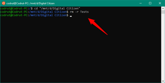 В качестве примера давайте удалим папку « Тесты », которую мы ранее создали в нашей папке «Digital Citizen». Для этого сначала нужно перейти в родительскую папку, которая называется Digital Citizen, с помощью команды: cd "/mnt/d/Digital Citizen". Затем мы должны запустить команду rm -r Tests.