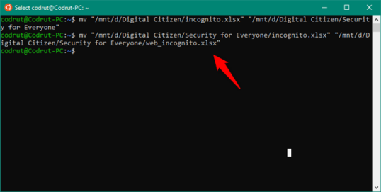 Используя тот же пример, что и раньше, давайте переместим файл incognito.xlsx из нашей папки Digital Citizen в подпапку «Безопасность для всех», а затем переименуем его в web_incognito.xlsx . Для этого нам нужно выполнить следующие команды: mv "/mnt/d/Digital Citizen/incognito.xlsx" "/mnt/d/Digital Citizen/Security for Everyone", а затем mv "/mnt/d/Digital Citizen/Security for Everyone/incognito.xlsx" "/mnt/d/Digital Citizen/Security for Everyone/web_incognito.xlsx".