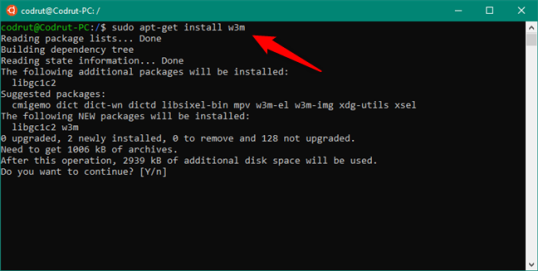 Затем, чтобы загрузить и установить нужное приложение для Linux, запустите sudo apt-get install [имя приложения] . Например, если мы хотим установить w3m , который является текстовым веб-браузером, нам нужно запустить sudo apt-get install w3m . Если приложению требуются дополнительные пакеты, возможно, вам придется подтвердить, что вы хотите продолжить, и в этом случае нажмите клавишу Y на клавиатуре.
