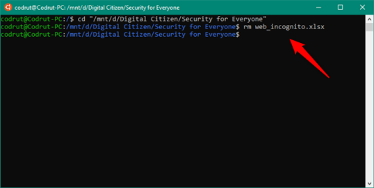 Удаление или удаление файлов в Bash производится с помощью команды rm [file] . Чтобы удалить файл web_incognito.xlsx, который мы создали ранее, сначала перейдите в нашу папку « Безопасность для всех », в которой он находится, с помощью команды cd "/mnt/d/Digital Citizen/Security for Everyone". Затем мы запускаем команду rm web_incognito.xlsx.