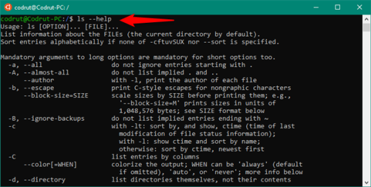 Если вы хотите узнать больше о том, что делает определенная команда, напишите ее в Bash и добавьте параметр --help. Отображаемая информация должна пролить больше света на структуру и использование этой команды. Взять, к примеру, команду ls, которая перечисляет содержимое папки. Это может показаться простой командой, но она предлагает довольно много опций для отображения информации. Вот часть помощи, которую вы получите за это: