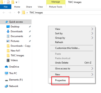 Щелкните правой кнопкой мыши в любом месте основной папки и выберите «Свойства» в меню.