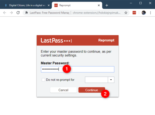 Введите ваш главный пароль LastPass еще раз, а затем нажмите или коснитесь Продолжить.
