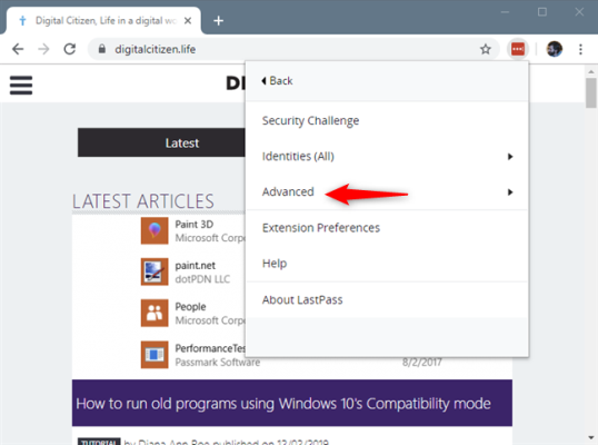 Чтобы экспортировать пароли из LastPass в файл, сначала откройте веб-браузер, а затем нажмите или нажмите кнопку LastPass.