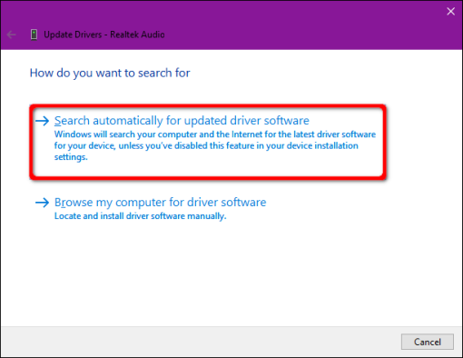 Выберите «Автоматический поиск обновленного программного обеспечения драйвера» в следующем окне.