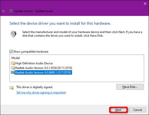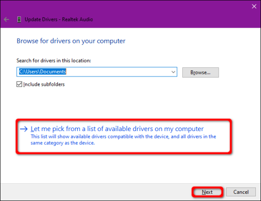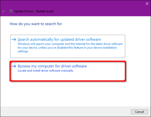 Кроме того, вы можете найти новые драйверы на сайте производителя звуковой карты и загрузить их на свой ПК. Если вы выберете этот маршрут, выберите вариант «Просмотреть мой компьютер для программного обеспечения драйвера». Просто направьте Windows 10 к месту загрузки.