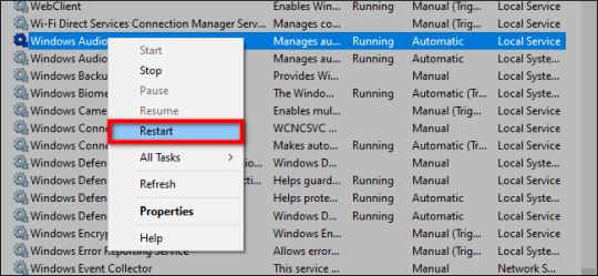 Для каждой службы щелкните один раз, чтобы выбрать ее, щелкните правой кнопкой мыши, чтобы открыть меню службы, а затем выберите параметр «Перезапустить». Если «Перезагрузка» неактивна, попробуйте «Обновить».