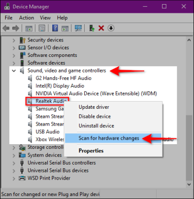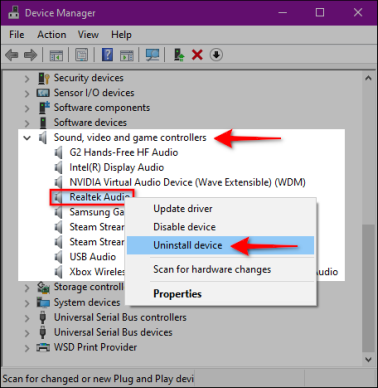 Windows 10 должна переустановить соответствующий аудиодрайвер после перезагрузки. Чтобы проверить, вернитесь в диспетчер устройств и посмотрите, отображается ли ваше аудиоустройство в разделе «Звуковые, видео и игровые контроллеры».