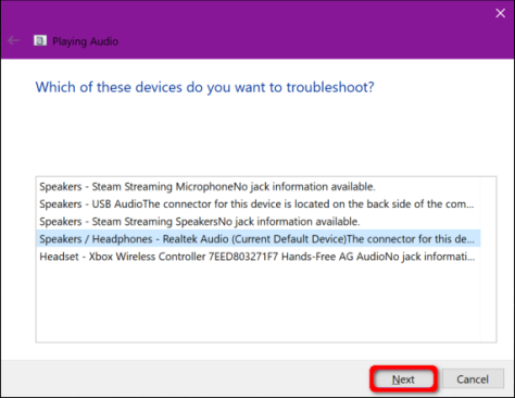 После того, как средство устранения неполадок сканирует аудиоустройства, выберите устройство, которое хотите устранить неполадки, и нажмите кнопку «Далее».