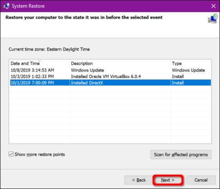 На следующем шаге установите флажок «Показать больше точек восстановления» и выберите точку восстановления, датированную до того, как у вас возникли проблемы со звуком. Нажмите кнопку «Далее», чтобы продолжить.