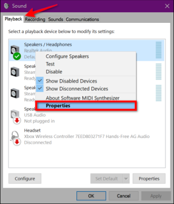 Выберите аудиоустройство в списке на вкладке «Воспроизведение» и щелкните правой кнопкой мыши, чтобы открыть меню. Выберите опцию «Свойства» внизу.