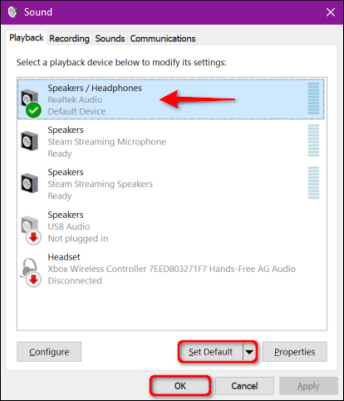 На экране появится всплывающее окно «Звук». Убедитесь, что ваше аудиоустройство установлено по умолчанию. Если нет, щелкните один раз на списке устройств, чтобы выбрать его, а затем нажмите кнопку «Установить по умолчанию». Затем нажмите кнопку «ОК», чтобы закончить.