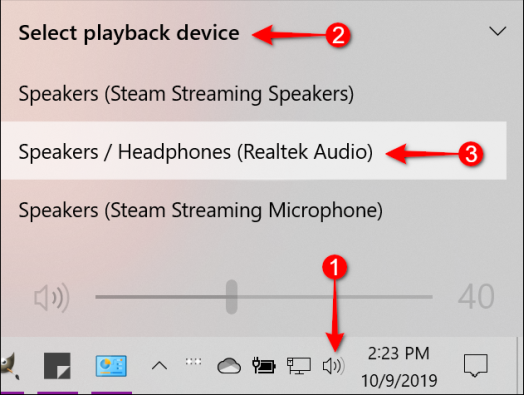 Нажмите на значок «динамик» рядом с системными часами. Вы увидите имя, указанное над всплывающей панелью громкости. Нажмите на имя, чтобы открыть всплывающий список с надписью «Выберите устройство воспроизведения» и выберите другое аудиоустройство, пока не услышите звук.