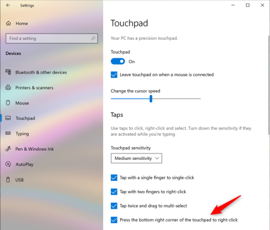 Если у вас точная сенсорная панель, вы также можете щелкнуть правой кнопкой мыши Windows 10 при каждом нажатии в правом нижнем углу сенсорной панели. Если вы хотите включить эту опцию, убедитесь, что параметр «Нажмите правый нижний угол сенсорной панели, чтобы щелкнуть правой кнопкой мыши» включен.
