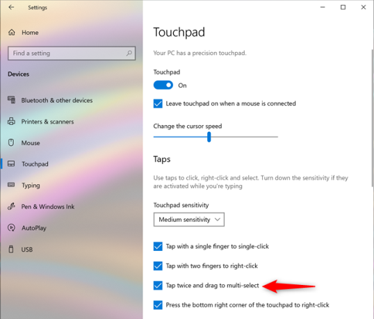 Вы также можете нажать, а затем быстро нажать еще раз и провести пальцем по сенсорной панели, чтобы выбрать несколько элементов, таких как файлы, папки или текст. Однако это работает только в том случае, если вы включили настройку сенсорной панели «Дважды коснитесь и перетащите для многократного выбора».