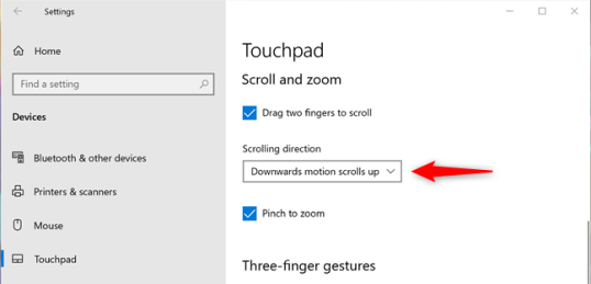 Нажмите или нажмите «Направление прокрутки» и выберите, хотите ли вы, чтобы на сенсорной панели движение вниз прокручивалось вверх или вниз.