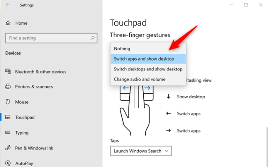 Прежде всего, есть Swipes: когда вы проводите тремя или четырьмя пальцами по сенсорной панели, Windows 10 можно настроить на «Переключение приложений и показ рабочего стола», «Переключение рабочих столов и показ рабочего стола», «Изменение звука и громкости» или «Ничего». В зависимости от того, что вы выбрали для установки Windows 10, когда вы проводите тремя или четырьмя пальцами по сенсорной панели, пролистывание иллюстрируется с помощью диаграмм со стрелками под списками пролистывания.