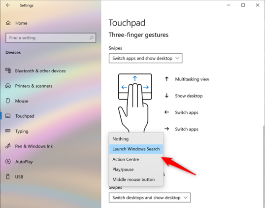 Списки касаний позволяют выбрать, что произойдет, когда вы касаетесь сенсорной панели тремя пальцами. Вы можете настроить Windows 10 на запуск поиска Windows, открытие Центра поддержки, воспроизведение/приостановку воспроизводимого мультимедиа, функцию средней кнопки мыши или ничего не делать.