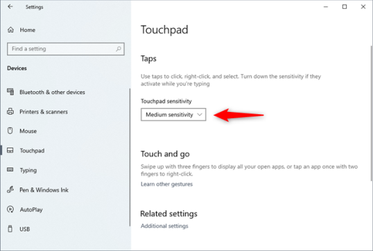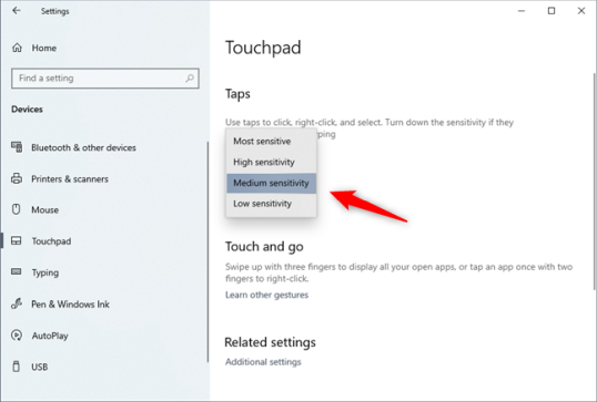 Если у вас точная сенсорная панель, приложение «Настройки» в Windows 10 также позволяет настроить чувствительность к нажатию. Это очень полезно для тех случаев, когда вы начинаете набирать текст на своем ноутбуке и случайно касаетесь сенсорной панели руками. В таких случаях вы можете обнаружить, что курсор перемещается, и вы печатаете в случайных местах, или что вы дважды щелкнули по объектам, и вы даже не заметили, что сделали. Чтобы избежать этого, в области «Касания» нажмите или коснитесь чувствительности сенсорной панели и выберите, хотите ли вы, чтобы тачпад имел низкую чувствительность, среднюю чувствительность, высокую чувствительность или был максимально чувствительным.