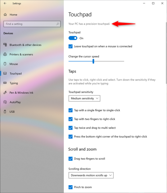 Если на вашем ноутбуке или планшете с Windows 10 установлена точная сенсорная панель, в правой части окна «Настройки» вы увидите сообщение: «На вашем компьютере установлена точная сенсорная панель». Кроме того, если ваш ноутбук или планшет с Windows 10 оснащен точной сенсорной панелью, вы можете настроить множество параметров, разделив их на различные разделы, такие как сенсорная панель, касания, прокрутка и масштабирование или жесты тремя пальцами.