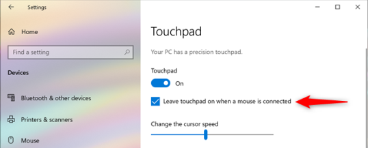 Windows 10 также позволяет вам выбрать, хотите ли вы, чтобы ваша сенсорная панель была включена или автоматически отключать ее, когда вы подключаете мышь к ноутбуку или планшету. Чтобы выбрать поведение сенсорной панели, которое вы предпочитаете, установите или снимите флажок «Оставлять сенсорную панель включенной, когда мышь подключена».