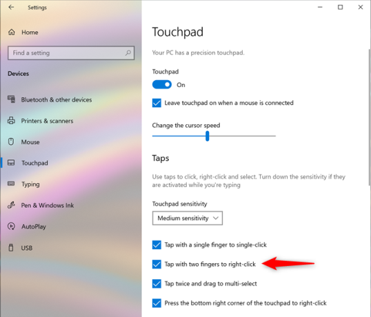 Вы также можете щелкнуть правой кнопкой мыши на сенсорной панели при каждом касании ее двумя пальцами. Для этого проверьте настройку «Коснитесь двумя пальцами правой кнопкой мыши». В Windows 10 и большинстве приложений это действие отображает контекстное меню, аналогичное щелчку правой кнопкой мыши.