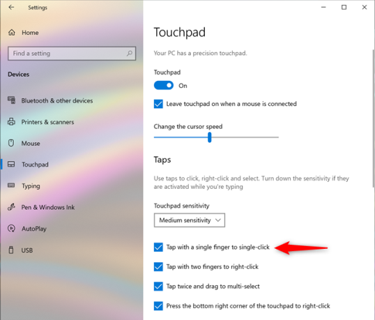 Даже если на сенсорной панели есть кнопки для левого и правого щелчка, вы можете нажать на нее, чтобы выполнить щелчок. Если у вас точная сенсорная панель, вы можете убедиться в этом, включив параметр «Нажать одним пальцем на один щелчок». Если вы этого не сделаете, снимите этот флажок.