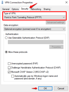 - Теперь выберите тип VPN как туннелирование точка-точка (PPTP) .