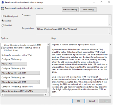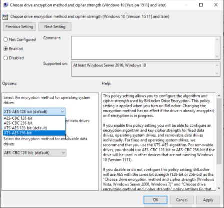 Вы можете заставить BitLocker использовать гораздо более надежное 256-битное шифрование AES вместо 128-битного AES. Несмотря на то, что 128-битное AES-шифрование будет длиться вечно, вы всегда можете сделать это навсегда и день, используя дополнительную силу.
