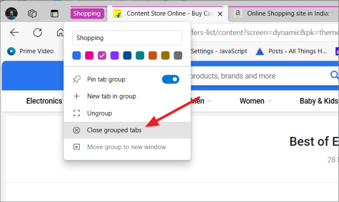 Чтобы закрыть все вкладки в группе, выберите «Закрыть сгруппированные вкладки».