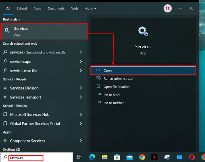 В меню «Пуск» откройте «Службы», выполнив поиск в поле «Начало поиска»: