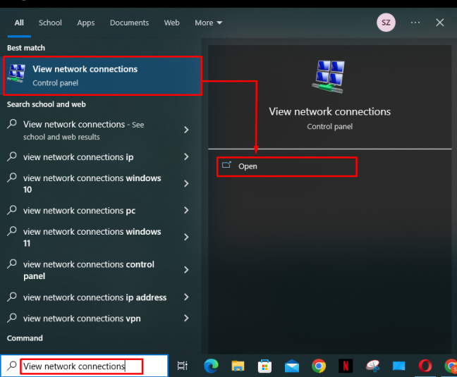 Нажмите сочетание клавиш «Windows+S», введите «Просмотр сетевых подключений» и выберите опцию «Открыть»: