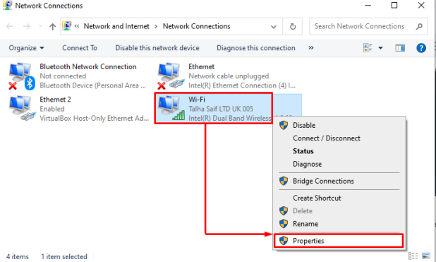 Из доступных сетевых подключений щелкните правой кнопкой мыши по тому, к которому вы подключены, и выберите в контекстном меню пункт «Свойства»: