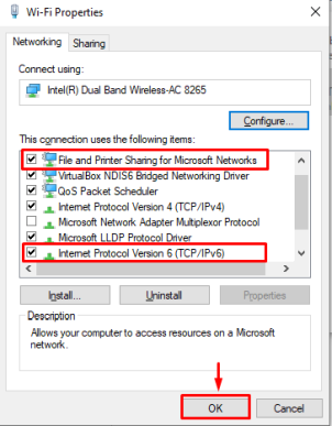 На вкладке «Сеть» окна свойств отметьте флажок «Общий доступ к файлам и принтерам для сетей Microsoft» и пункт «Протокол Интернета версии 6 (TCP/IPv6)» из списка: