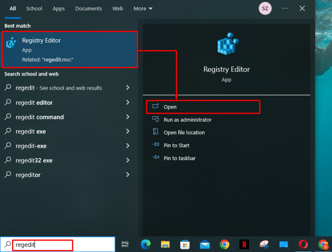Нажмите сочетание клавиш «Windows+S», введите «regedit», чтобы открыть «Редактор реестра»: