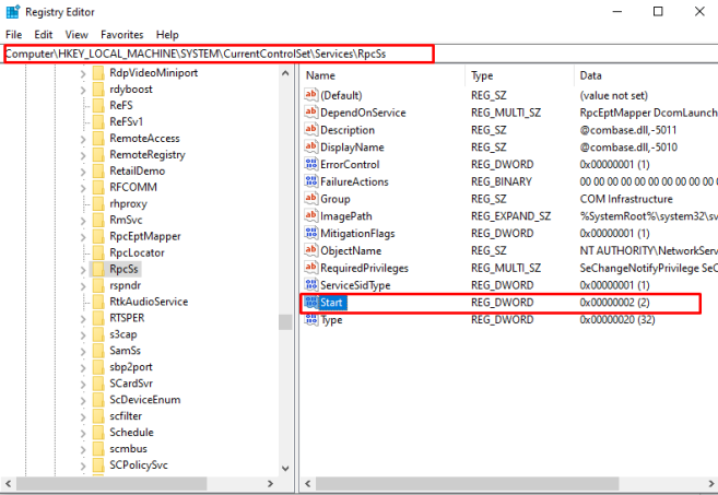 После открытия редактора реестра перейдите по маршруту «HKEY_LOCAL_MACHINE > SYSTEM > CurrentControlSet > Services > RpcSs» и найдите клавишу «Пуск» в правой панели окна: