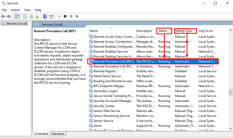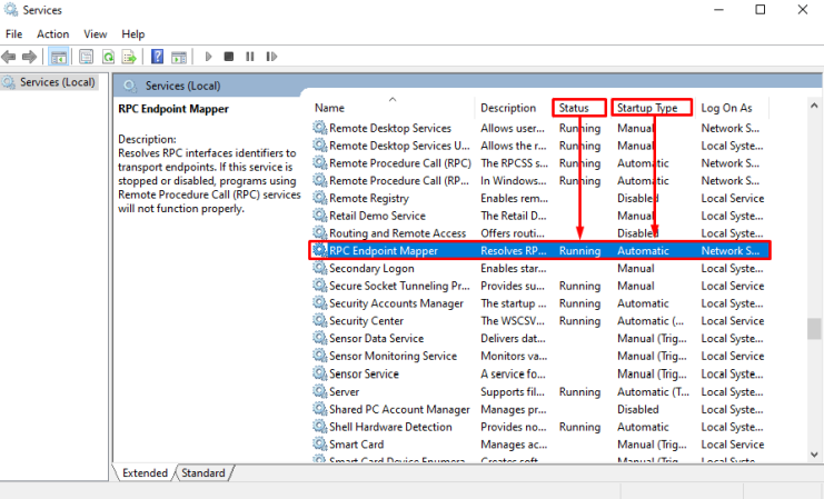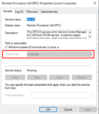 Проверьте те же параметры для службы «Удаленный вызов процесса (RPC)» и проверьте, запущена ли она: