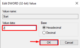 Теперь дважды щелкните кнопку «Пуск» и измените ее «Значение данных» на «2»: