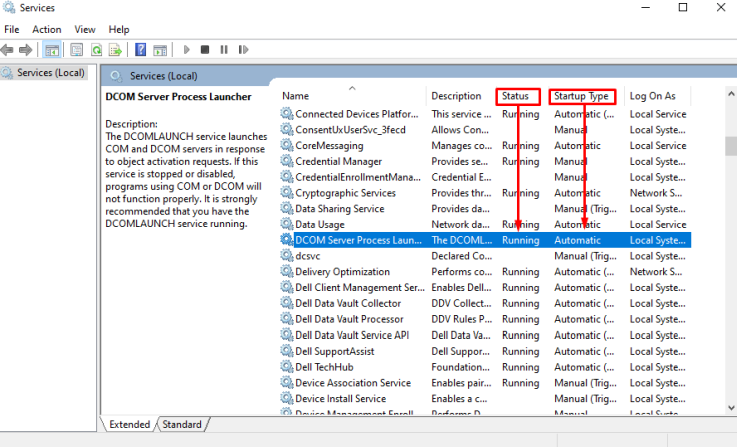 В списке «Службы» найдите «Средство запуска серверных процессов DCOM» и убедитесь, что статус «Выполняется», а тип запуска — «Автоматический»: