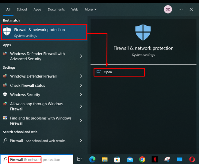 В меню «Пуск» откройте «Брандмауэр и защита сети», выполнив поиск «Брандмауэр» в поле начального поиска: