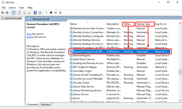 Снова найдите службу «Локатор удаленного вызова процедур (RPC)» и проверьте, запущена она или нет:
