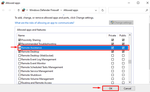 Затем в списке разрешенных приложений найдите «Удаленный помощник» и установите флажки для параметров «Общественный» и «Частный». Затем нажмите кнопку «ОК»: