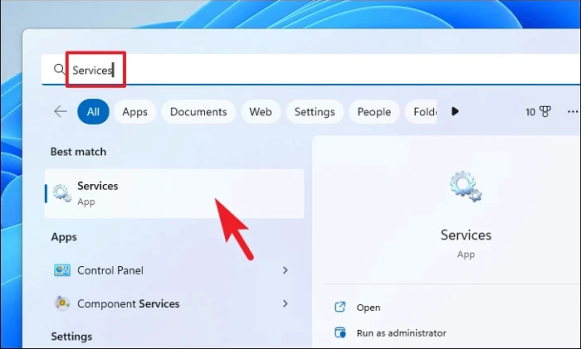 Сначала откройте меню «Пуск» и введите «Сервис», чтобы выполнить поиск. Затем в результатах поиска нажмите на плитку «Услуги».