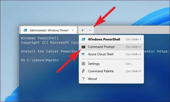 После этого нажмите значок «шеврон» (стрелка вниз) и выберите параметр «Командная строка».