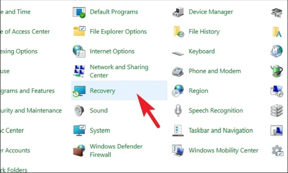 После этого найдите и нажмите плитку «Восстановление» в сетке значков.